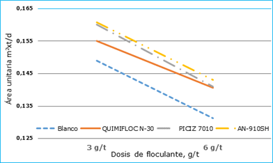 El comportamiento del área unitaria, aplicando el floculante QUIMIFLOC N-30, con la dosis de 3 g/t, se requiere de 3,15 % y 3,58 % área unitaria inferior a la requerida al aplicar los floculantes PICIZ 7010 y AN-910HS, respectivamente, tal y como se observa en la Figura 2.