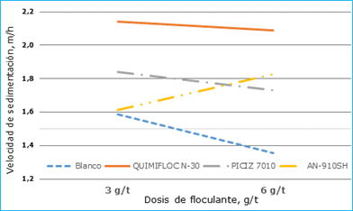 En la Figura 3 se observan las velocidades de sedimentación obtenidas para cada uno de los floculante evaluados, para cada una de las dosis; el floculante de mejor resultado fue el QUIMIFLOC N-30 que alcanzó los valores mayores.