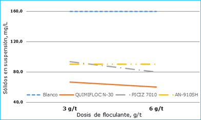 En los sólidos en suspensión, para cada uno de los polímeros evaluados, no se logran diferencias significativas al incrementar las dosis para cada uno de los floculantes; los valores más bajos se alcanzan con el Quimifloc N-30 (Figura 4).