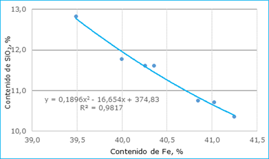 Tal y como se observa en la Figura 5, en la medida que disminuye el contenido de Fe en el mineral alimentado se incrementa el contenido de SiO2, con un coeficiente de correlación fuerte: R2=0,9817.