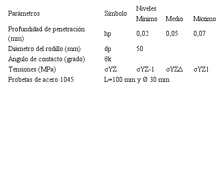 Para establecer el comportamiento de la deformación plástica por rodillo del acero AISI 1045, a partir del método de la cicloide, se seleccionaron tres niveles (mínimo, medio y máximo), lo cual está determinado por el mayor o menor grado de endurecimiento que se quiere lograr en el material o por la mayor o menor homogeneidad en la estructura. Los parámetros de deformación se muestran en la Tabla 1.