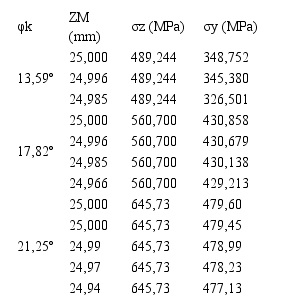 Las tensiones normales para los ejes “z” e “y” se determinaron a partir de las ecuaciones 9 y 10. Para resolver ambas ecuaciones se requiere de los resultados de las ecuaciones 11 y 12, que analizan el ancho a la mitad de contacto del rodillo (Z), cuyos valores dependen del ángulo de contacto (φk), de la ecuación 8 y de h (ecuación 1); para h=0,7 mm, Z=8,6 mm; para h=1,3 mm, Z=47,60 mm y para h=1,7 mm, Z=46,60 mm. Las tensiones normales dependen, además, de la variación de la profundidad en la pieza (Zk), con h=0,7 mm, Zk=24,98º; con h=1,3 mm, Zk=24,95º y con h=1,7 mm, Zk=24,93º. Los resultados de las tensiones normales en los ejes “z” e “y”, en dependencia del ángulo de contacto φk y ZM, son mostrados en la Tabla 2.
