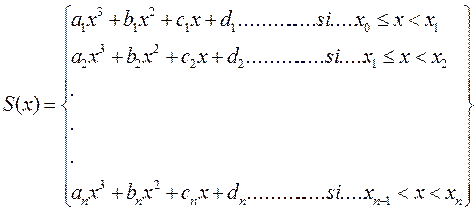 (16)l procedimiento práctico para encontrar los valores de a1,…an, b1,…bn, c1,…cn, d1,…dn fue tomado de Álvarez y demás investigadores (2002). Dado que S''(x) está relacionada con la curvatura de la gráfica de S(x), entonces, la propiedad 16 significa que para S(x) se tiene la curvatura global mínima con respecto a cualquier otra función interpoladora.