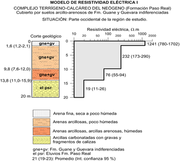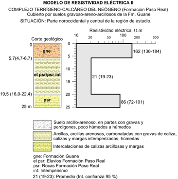 Las resistividades eléctricas promedio de 232 y 76 Ω·m, respectivamente, de las capas intermedias, están condicionadas, principalmente, por el aumento del grado de saturación de los suelos arcillo-arenosos con la profundidad.