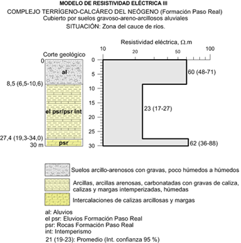 Este modelo de resistividad eléctrica se define por la presencia de un espesor de suelos aluviales recubriendo los depósitos miocénicos, siendo característico para las zonas del cauce y primer nivel de terraza de las corrientes fluviales que atraviesan la región de estudio (Figura 6). Un rasgo característico de estas zonas es la variabilidad de las condiciones geólogo-geoeléctricas, como resultado de la complejidad del ambiente de deposición de los sedimentos.
