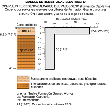 Los mayores valores de resistividad eléctrica (hasta varios cientos de Ω·m) corresponden a los suelos de cubierta, mientras que los sedimentos paleogénicos presentan, al igual que en el caso anterior, muy baja resistividad (menos de 25 Ω·m).