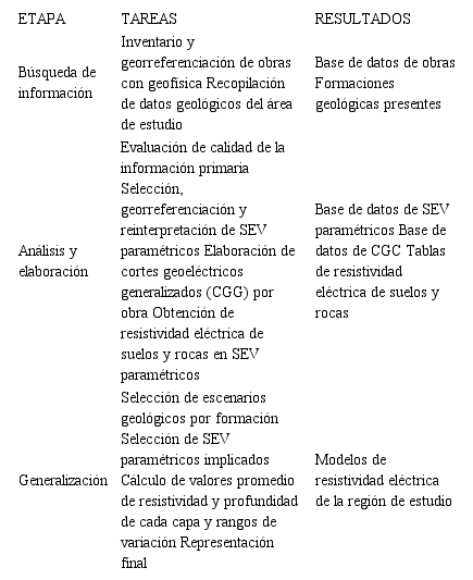 La metodología elaborada para la generalización de la información geoeléctrica de archivo constó de tres etapas, cuyas tareas y resultados se muestran en la Tabla 1.
