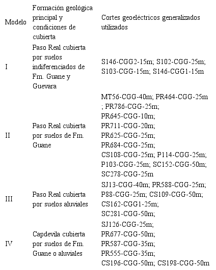 El procedimiento utilizado para la elaboración de los modelos de resistividad eléctrica se inició con la identificación del escenario geológico-geofísico a modelar, pasando posteriormente a la selección de los CGG que lo caracterizan (Tabla 2).