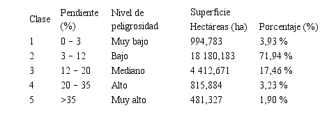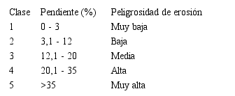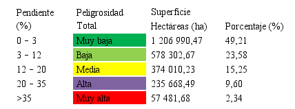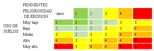 Cuando sea posible, se tomará el valor intermedio entre las dos variables. Por ejemplo, si la pendiente=3 y el uso del suelo=1, entonces la peligrosidad de erosión será igual a 2.