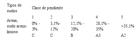 El factor suelo se sintetizó a través del componente de erodabilidad que indica la susceptibilidad de los suelos a ser erosionados; su determinación está en función del porcentaje de arena más limo, de arena, de materia orgánica, de la estructura del suelo y su permeabilidad. A continuación, aparecen las tablas que correlacionan los tipos de suelo y la pendiente (Tabla 2).