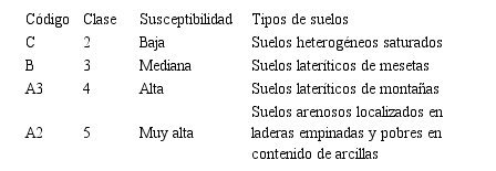En la susceptibilidad del suelo a la erosión hídrica es importante establecer el tipo de textura del suelo en el caso de la ciudad de Brazzaville tenemos: suelos heterogéneos saturados (C), lateríticos de mesetas (B) y lateríticos de montaña (A3), suelos arenosos de laderas y pobres en contenido de arcillas (A2) (Tabla 3).