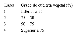 La vegetación es analizada según el grado de cobertura vegetal (Tabla 4) en el área de estudio. Se aplicó la ecuación presentada a continuación.