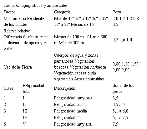 Al estudiar el relieve se tomó en consideración el factor del terreno: longitud de la pendiente (L) y su inclinación (S) (Tabla 1). El factor del terreno permite conocer la peligrosidad por erosión hídrica a través del relieve; este fue dividido en cinco clases.