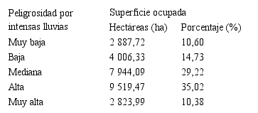Según el mapa, la peligrosidad por intensidad de lluvia en 24 horas para un período de retorno de 100 años se divide en 5 clases (muy alta, alta, moderada, baja y muy baja). La clase de peligrosidad muy baja corresponde a los valores de menos de 1 450 mm y representa el 10,60 % del área total; la peligrosidad baja es de 1 450-1 550 mm, constituyendo el 14,73 % del área total; la clase de peligrosidad media tiene valores de 1 550-1 850 mm de lluvia y ocupa el 29,22 % del área total; la peligrosidad alta tiene valores mayores de 1 850-2 150 mm y representa el 35,02 % del área total y la peligrosidad muy alta tiene valores superiores a 2 150 mm y representa el 10,38 % del área total. Como puede observarse, la zona norte de la ciudad es la más lluviosa y posee la mayor peligrosidad de erosión por lluvia (Tabla 7).