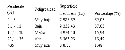 Las zonas llanas poseen pendientes de 0 % a 3 % se refieren a las áreas que presentan pérdidas insignificantes del suelo, independientemente del uso o presencia de fuertes lluvias, por lo que la peligrosidad de erosión es muy baja. Las pendientes de 3 % a 12 % son áreas donde la peligrosidad de erosión es baja y se puede controlar con las prácticas de adecuada gestión. Las pendientes de 12 % a 20 % se vinculan a la peligrosidad de erosión media o moderada y los tipos de usos de la tierra son limitados. Las pendientes de 20 % a 35 % son consideradas como los sitios con peligrosidad a la erosión elevada y, por lo tanto, no son terrenos aptos para la construcción de viviendas sin estudios geotécnicos previos. Las pendientes de más de 35 % son áreas con una alta peligrosidad de erosión debido a la alta velocidad adquirida por el agua de lluvia con carencia de la vegetación.(Tabla 5)