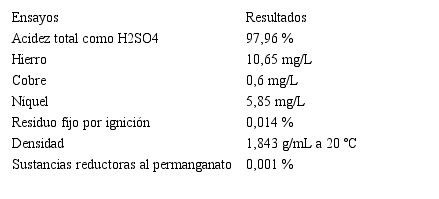 Para la realización de las pruebas se utilizó una muestra del yacimiento Río del Callejón, los resultados del análisis químico y granulométrico se exponen en la tabla 1. Las características del ácido sulfúrico empleado en la lixiviación, procedente de la Empresa Rayonitro se muestran en la tabla 2.