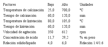 Resumen: Con el objetivo de obtener sulfato de aluminio para su uso industrial como coagulante en el tratamiento de las aguas, se realizaron pruebas experimentales a escala de laboratorio con una muestra del yacimiento Río del Callejón perteneciente al municipio especial Isla de La Juventud, la muestra caracterizada desde el punto de vista químico y granulométrico fue sometida a un proceso tecnológico que tuvo como operaciones fundamentales la calcinación y la lixiviación con ácido sulfúrico. Para la realización de las pruebas tecnológicas se empleó el método de tamizado de Plackett – Burman, para lo que se tuvieron como variables independientes; temperatura de calcinación, tiempo de calcinación, temperatura de lixiviación, tiempo de lixiviación, velocidad de agitación, concentración de ácido y relación líquido sólido. Como resultados fundamentales del trabajo se obtuvo, el sulfato de aluminio con características apropiadas para ser empleado como sustancia coagulante para el tratamiento de aguas de consumo humano y de aguas residuales. Se confirmó mediante una corrida adicional en la cual se obtuvo aproximadamente un 17 % más del producto de interés, que las variables independientes de mayor influencia en el proceso de obtención del sulfato de aluminio, son: en primer lugar la temperatura de calcinación y en menor grado y en orden descendiente, la relación sólido / líquido y el tiempo de lixiviación.