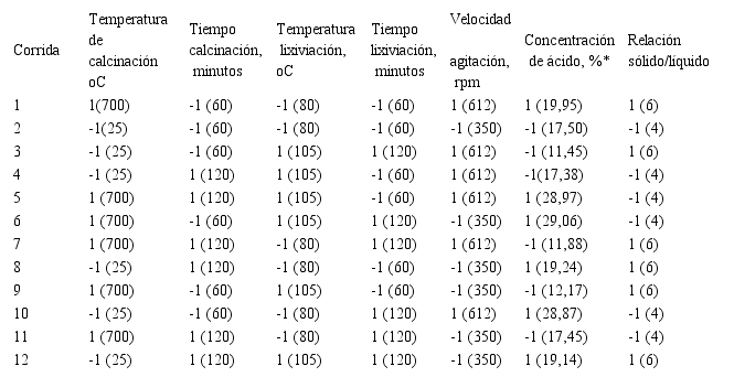 Para determinar la influencia de las variables independientes, se elaboró una matriz de experimentos según el método de tamizado Plackett–Burman empleando el software estadístico Statgrafics Centurión XVI como se observa en la Tabla 4.