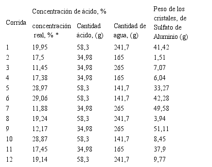 Teniendo en consideración lo anterior, se hace una corrida adicional, donde se aumenta el tiempo de lixiviación a 180 minutos, con los valores de las otras variables independientes iguales. El valor de la variable respuesta, peso de los cristales, en estas condiciones fue de 60 gramos de sulfato de aluminio, este valor representa cerca del 17 % más del máximo valor alcanzado en la corrida 9 del diseño (51,11 gramos de sulfato de aluminio).