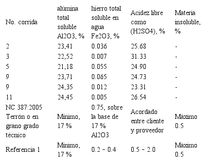 Como resultado de la prueba tecnológica con la muestra del yacimiento Río del Callejón se puede aseverar que los cristales de sulfato de aluminio obtenidos de la lixiviación del caolín de Río del Callejón con ácido sulfúrico, son blancos. De las 12 corridas experimentales en seis, la lixiviación produjo la sal de interés en cantidades significativas que resultan de interés práctico. La tabla 8, expone las corridas y los análisis llevados a cabo según la norma cubana NC 387: 2005. Productos químicos para uso industrial. Sulfato de aluminio.
