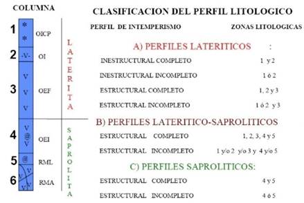 El perfil litológico de las cortezas lateríticas ferroniquelíferas-cobaltíferas, está formado por zonas (capas u horizontes) resultantes de los procesos de intemperismo. Existen diversas clasificaciones de esos horizontes, pero en Cuba la más utilizada es la de Lavaut-Copa (2005) que se muestra en la Figura 1.