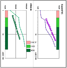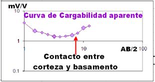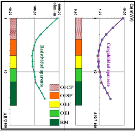 Para la interpretación de los SEV-PI se construyeron las curvas de resistividad (ρa) y cargabilidad (Ca) aparente (Danko & Azze 1972). El método de interpretación utilizado fue el de los puntos característicos. A partir de la calibración de los sondeos paramétricos con los datos de pozo se obtuvo que la profundidad de estudio en estas condiciones resultó igual a la abertura AB/2 máxima (Telford, Geldart & Sheriff 1990).
