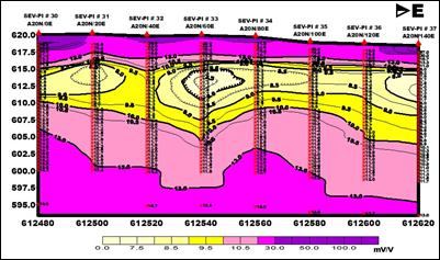 Las Figuras 11 y 12 representan, respectivamente, un mismo corte de cargabilidad y de resistividad aparente, donde predominan las curvas de tipo “H”. En la Figura 11 el color magenta representa los valores bajos de Ca, los cuales se asocian geológica y espacialmente con los ocres inestructurales en el tope del corte y con la roca madre en la base del corte y los colores amarillos, los valores bajos de cargabilidad aparente, que cartografían los OEF en la parte central del corte. En la Figura 12 el color azul fuerte representa los valores bajos de ρa, los cuales se asocian geológica y espacialmente con los ocres estructurales finales y el magenta y el amarillo, los valores altos de resistividad aparente, que cartografían los OI en la parte superior del corte, y el basamento en la parte inferior del corte.