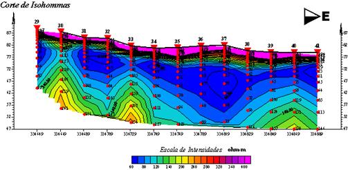 Con los datos adquiridos en los levantamientos se confeccionaron tablas, curvas de variación de las dos propiedades físicas: ρa y Ca, con la profundidad en cada punto físico estudiado, mapas de tipos de curvas, cortes de curvas de nivel de resistividad aparente ρa (iso-ohmas) y cortes de curvas de nivel de cargabilidad aparente Ca (Danko & Azze 1972).
