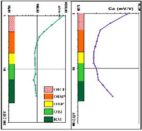El 50 % de las curvas de Ca son del tipo “H”, lo que revela la presencia de todas las litologías (OICP; OISP; OEF; OEI; RML, RMA) en el corte laterítico, correspondiendo los valores altos de la primera rama a los OI, mientras que a los OEF se asocian los valores más bajos de la curva. La última rama de la curva, donde los valores vuelven a ser altos, se asocian geológica y espacialmente con los OEI y la RML, RMA. El 30 % de las curvas de Ca son del tipo “A”, las cuales indican un corte con potencia de OI menor que 5 m o incluso nula.