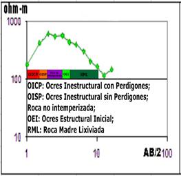 Este tipo de curva H (Figura 5) es una de las más difundidas en las cortezas de intemperismo de Cuba oriental. La rama superior de la curva presenta valores altos, localizados geológica y espacialmente sobre materiales lateríticos con zonas de cuarcificación, sílice y los ocres inestructurales (OI), en general, debido a la existencia de oxi-hidróxidos de Fe (perdigones), los cuales se polarizan y a la vez ofrecen una alta resistencia al paso de la corriente por el medio. La intensidad de los valores depende de la abundancia y diseminación de ellos y de la forma en que están interconectados, así como de la presencia o no de agua.