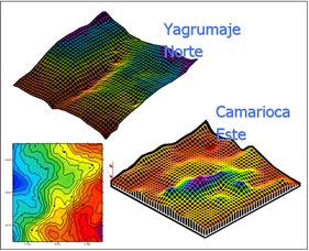 Con estos materiales se construyeron mapas del relieve del basamento (Figura 9) y cortes geólogo-geofísicos, con los que se pudo determinar una voluminosa información, como la cartografía de la tectónica del área, los cambios de composición litológica, los espesores de los horizontes de la corteza, la profundidad del nivel freático y la profundidad a que se encuentra el basamento de roca dura no alterada. Con los cortes interpretados, incluyendo también los datos arrojados por la red de perforaciones, se hicieron cálculos de recursos, los cuales fueron evaluados positivamente por los especialistas de la Oficina Nacional de Recursos Minerales de Cuba, quienes han emitido los correspondientes avales de aceptación satisfactoria.