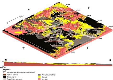 El nivel de conocimiento actual de las condiciones geólogo-geotécnicas de la ciudad de Pinar del Río permitió la confección del modelo geológico-geotécnico 3D para su corte cenozoico más superficial. En el modelo elaborado se identifican seis tipos ingeniero-geológicos (TIG): rellenos artificiales, capa vegetal, aluvial marino grueso, aluvial marino fino, eluvial y rocoso.