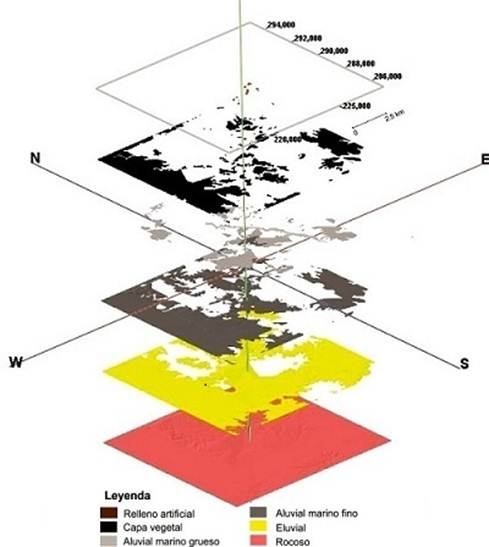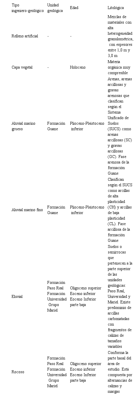 De acuerdo con el origen y las edades de cada uno de los depósitos citados en la Tabla 1 la parte alta de corte estratigráfico sería ocupada por los rellenos artificiales y la parte baja por el tipo ingeniero-geológico rocoso. Este último, además de ocupar la base del corte cenozoico, también aflora en las zonas positivas del relieve y en algunos cauces fluviales.