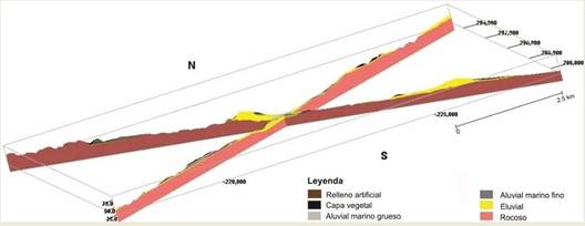 La Figura 6 muestra dos cortes orientados en direcciones ortogonales. La vista revela una buena relación en la ocurrencia de los tipos ingeniero-geológicos “eluvial” y “rocoso” con las zonas positivas del relieve (en este caso superiores a los 40,0 m sobre el nivel medio del mar); quedando reservados las pequeñas depresiones y los sectores llanos para la acumulación de los TIG aluviales marinos finos y gruesos.
