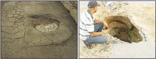 Aluvial marino grueso: El fenómeno geológico-geotécnico reportado con más recurrencia en estos suelos ha sido la erosión subterránea; algunas veces identificado también en la literatura técnica con el término sufusión. Este fenómeno se ha originado, especialmente, debido a la composición granulométrica de los suelos aluviales marinos gruesos; en los que resalta un 60,16 % de arena, para un 64,61 % de la fracción gruesa (gravas y arenas) (Tabla 2). Estas condiciones naturales, en combinación con elevados gradientes hidráulicos que eventualmente se desarrollan por roturas en redes hidráulicas, han generado en la ciudad algunos colapsos de la carpeta asfáltica (Figura 7).