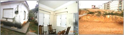 Donde, a y b: grietas bien desarrolladas en los muros de la vivienda y c: afloramientos de arcillas en las cercanías de la vivienda.