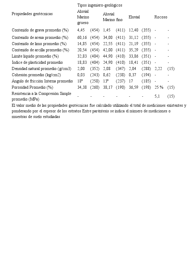 Un segundo dato de partida para alcanzar el objetivo previsto en esta investigación lo constituyen los valores promedios de las propiedades físicas y mecánicas de los diferentes tipos ingeniero-geológicos (TIG) que conforman el corte geotécnico. Esta información se obtuvo de los trabajos de Govea (2014), Gilbert (2014) y Chinthaka (2015).