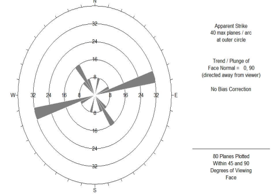 Familia de grietas 1: Azimut del buzamiento 160o–200o. El ángulo de buzamiento varía desde 0o hasta 50o. Se observa una extensión de 0–15 m, la distancia entre las grietas es de 0,2–1,0 m. Las direcciones predominantes según el rumbo de las grietas N75o E.