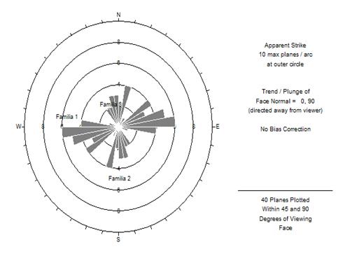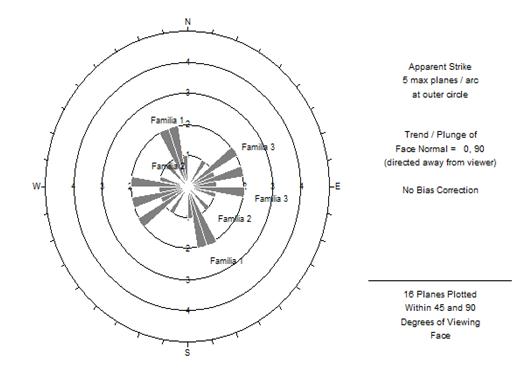 De este modo, la técnica de la proyección estereográfica brindó la información de las distintas familias de grietas que intervienen en el macizo. Finalmente, se realizó la interpretación de la salida gráfica dada por las rosetas.