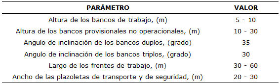 La cantera está proyectada para un minado a cielo abierto, con el arranque directo y carga de la masa minera, con excavadoras de 5 a 18 m3 de capacidad. En el caso de las rocas de destape que rodean el kimberlito (los gneises) el arranque se realiza mediante voladura; se emplean los mismos equipos para la carga y el transporte se realiza en camiones de 40-100 toneladas y en bandas transportadoras de hasta 2,5 km. Los parámetros de explotación se reflejan en la Tabla 1.