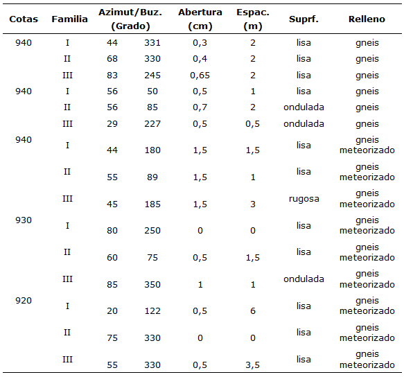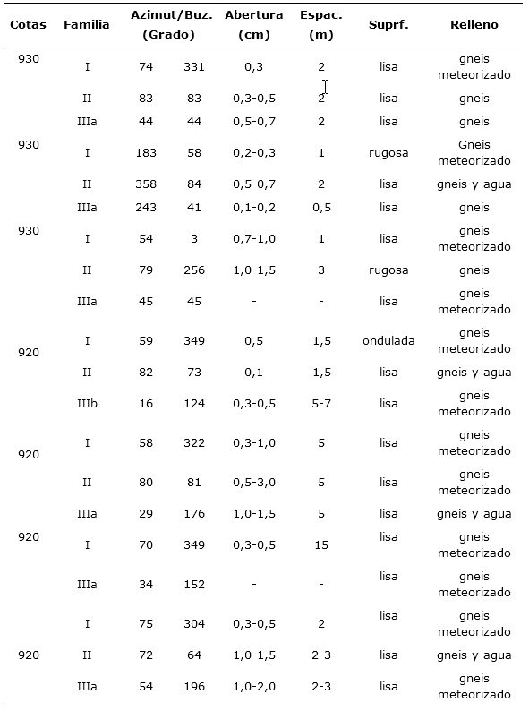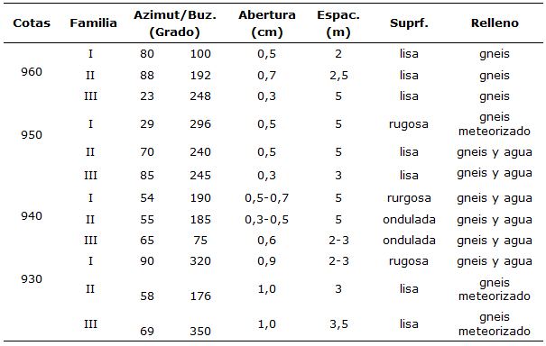 La información de las distintas familias de grietas que intervienen en el macizo aportada por la proyección estereográfica se ofrece en las Tablas 3, 4 y 5. De esta valoración se señala que existe un alto grado de afectación del macizo por agrietamiento, y la existencia de grietas en todas las direcciones. En las grietas es más abundante el relleno de gneises meteorizado. La presencia de agua en las grietas, por lo general, es mucha, prácticamente en todas las estaciones del año, y se agudiza aún más en la época de lluvias. Prevalecen grietas sanas y no alteradas a medida que se profundiza en la mina. La caracterización general del agrietamiento en los tres sectores investigados se puede resumir en lo siguiente: