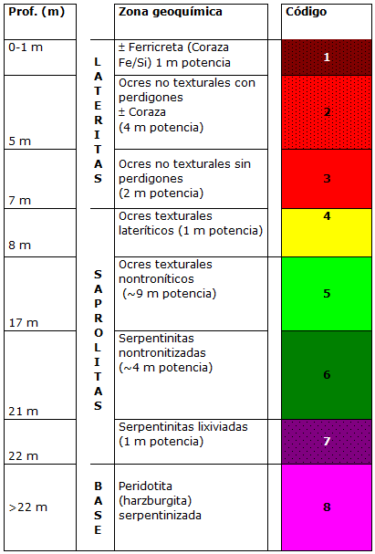 Proenza-Fernández (2015) y Bucher, Stober y Muller (2015) reconocen la zonalidad geoquímica vertical que presentan los perfiles lateríticos mediante la aparición secuencial de la asociación de minerales, desde la roca madre hasta las zonas superiores del perfil de alteración.