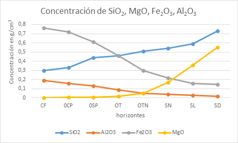 Los resultados del cálculo del balance de masas muestran cómo ocurre la reducción de los componentes más móviles (magnesio, sílice) y el aumento de los acumulativos (hierro, aluminio) hacia arriba en el perfil. Este hecho está relacionado con la extracción de los elementos químicos y los procesos de autoenvejecimiento del sistema coloidal por medio de la cristalización de los geles.