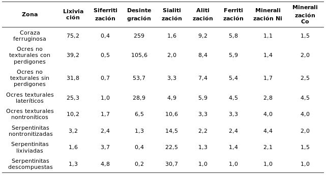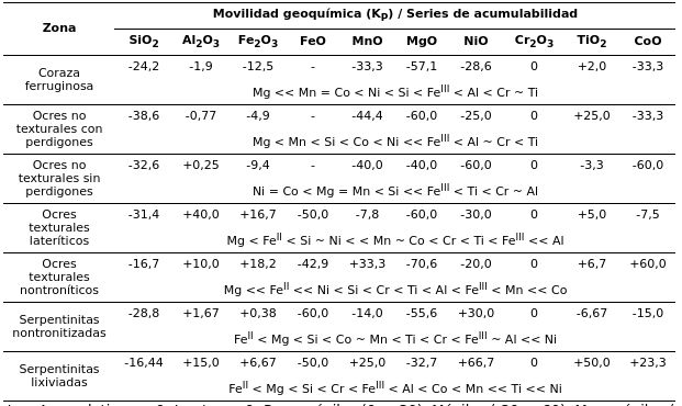 En la Tabla 3 se exponen las características de la movilidad geoquímica de los elementos durante la meteorización de las ultrabasitas de San Felipe.