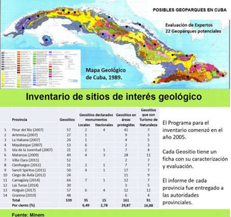 Recientemente, Cuba aprobó las resoluciones 81/2020 y 82/2020, como marco legal para la exportación de muestras geológicas para estudios e investigaciones y las normas para declarar geositios, geoparques y los principios de conservación de los geositios y las muestras geológicas, como parte del patrimonio geológico, en correspondencia con la política para el perfeccionamiento de la actividad de investigación geológica e implementación del Servicio Geológico de Cuba.