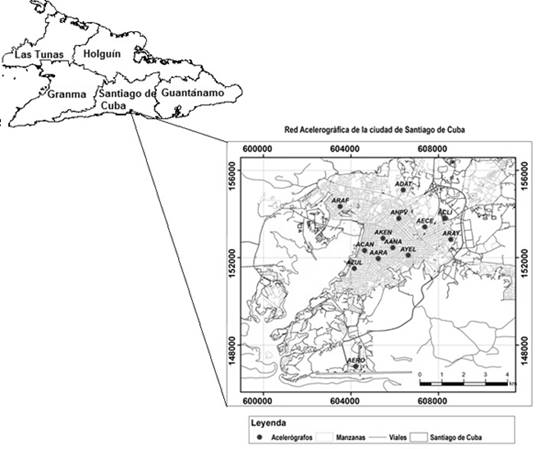 La ciudad de Santiago de Cuba se ubica en la provincia y municipio de igual nombre (Figura 1), en la región oriental cubana. Cuenta con una red acelerográfica integrada por 13 estaciones, formada por equipos Guralp y Nanometrics, modelos CMG-5TDE; Titán SMA y TMA-33.