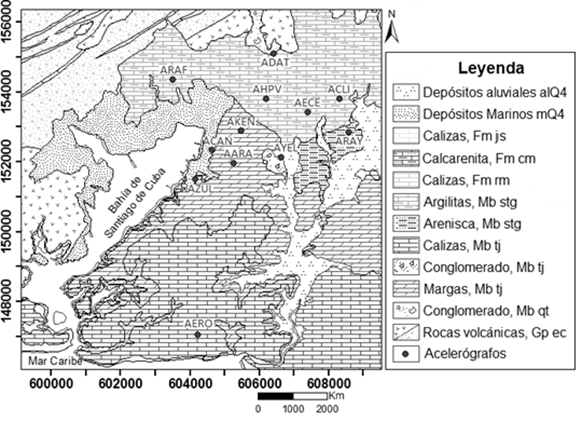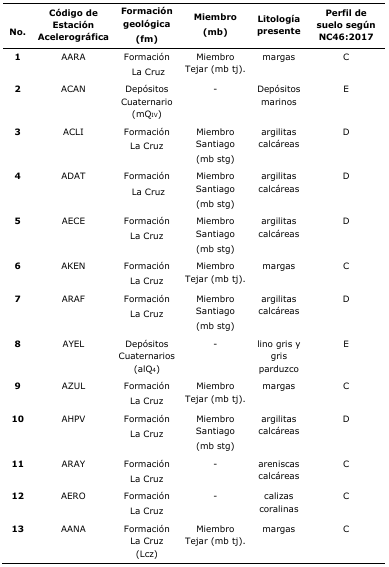 En el diseño de la base de datos se consideraron la ubicación geográfica de cada estación con sus coordenadas planas (Proyección Cónica Conforme de Lambert) (Tabla 1), así como la litología y perfil de suelo presente según la Norma Sísmica (NC46:2017). Los instrumentos se encuentran colocados en diferentes litologías (Figura 2), basado en el esquema geológico de la cuenca de Santiago de Cuba (Medina et al. 1999) a escala 1:25 000 y el léxico estratigráfico (Colectivo de autores 2013). Las estaciones acelerográficas se asientan sobre la formación La Cruz que incluye a los miembros Tejar y Santiago y sobre los depósitos del Cuaternario (Tabla 2).