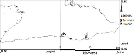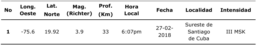 Apoyados en la red sismológica del Servicio Sismológico Nacional de Cuba (SSNC) y en sus boletines especiales, en caso de sismos perceptibles con información preliminar, así como boletines mensuales, resúmenes trimestrales o semestrales y el resumen de la sismicidad del año, se seleccionó el terremoto perceptible de mayor magnitud del año 2018; en este caso, 27 de febrero del 2018 con magnitud 3.9 Richter (CENAIS 2018), cuys datos muestra la Tabla 3.