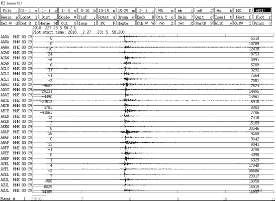 El registro acelerográfico del terremoto del 27 de febrero del 2018 (Figura 4) se obtuvo mediante el software SEISAN 10.1. Para obtener los valores de amplitud en las tres componentes (HNN, HNE, HNZ) se utilizaron herramientas del programa SEISAN como el comando > dirf2020* que genera un fichero filen.lis. En la pantalla filen.lis a cada componente acelerográfica se le asigna un número. Después se debe utilizar el comando multplt, para plotear las señales. Se observa una nueva pantalla donde muestra en la parte superior un menú e información del evento analizado, la componente analizada, la estación acelerográfica y muestra el acelerograma, en la parte inferior se observa el valor máximo de amplitud.
