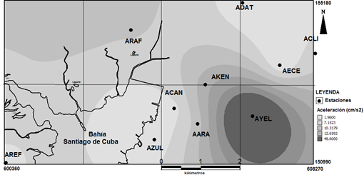 Se obtiene el esquema de isolíneas de aceleraciones para la ciudad de Santiago de Cuba pertenecientes al terremoto perceptible del 27 de febrero del 2018 mediante un sistema de información geográfica gvSIG (Figura 5). Al realizar la interpretación de este esquema se alcanzan los valores de aceleración (Ac) ubicados en zona donde se esperan incrementos de la intensidad sísmica de hasta +1 grado MSK, basado en las condiciones geológicas presentes y profundidad de los niveles freáticos. Las estaciones donde se lograron los máximos valores son ARAF con 12.10 cm/s2 ubicada sobre argilitas calcáreas; AARA tiene un valor de 13.50 cm/s2 y AKEN con 19.10 cm/s2 ambas estaciones situadas sobre margas, y AYEL con 48.60 cm/s2 localizada sobre depósitos cuaternarios. Existe correlación directa entre los valores de la aceleración obtenidos y la intensidad sísmica reportada.